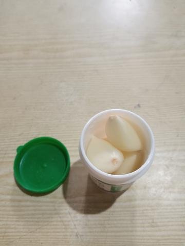 Luego en un frasco, lo suficientemente grande para que entren todos los dientes que se desean plantar los metemos todos. En mi caso voy a utilizar este pequeño frasco de plástico con tapa, pero cualquier frasco que ustedes tengan a la mano les sirve sea de vidrio o de metal, incluso si no tienen frascos adecuados a la mano pueden usar papel aluminio. Y si el frasco no tiene tapa pueden taparlo con papel aluminio.