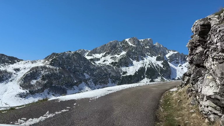 Afterward we returned to Durmitor to see the entire park. Surprisingly, by the time we went to the bridge and back, the park staff had cleared almost the entire road. And this road isn’t just 5-10 kilometers. The surrounding beauty is all around; the road winds along the rocks, sometimes rising, sometimes gently descending, sometimes approaching snow-covered mountain peaks. You occasionally encounter small viewing terraces. In short, a paradise for anyone who loves road trips.