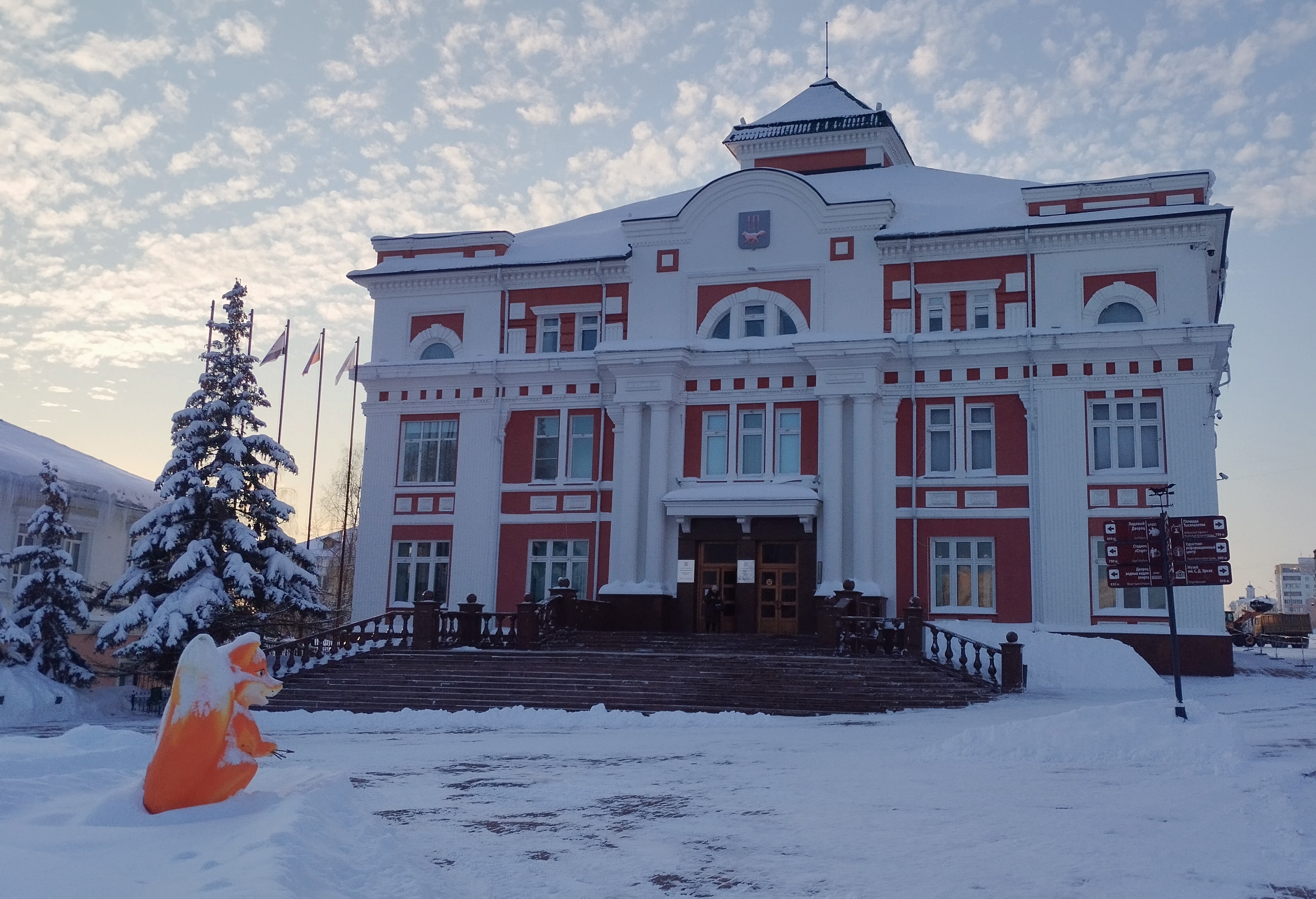 In front of another one administrative building located monument of fox. Fox is the symbol of Mordovia and Saransk, historically representing intelligence, cunning, insight, and wealth. This image has been established since 1781, when Empress Catherine II approved the coat of arms of Saransk with a red fox, symbolizing the hunting traditions of the region and prosperity. In addition, the image of the fox is associated with the development of hunting, which was one of the main occupations of the indigenous population of Mordovia. Currently, the fox is a popular tourist brand of the republic.