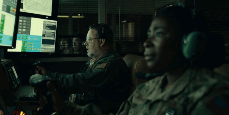 Algo que sí tengo que reconocer es que la película muestra lo brutal y caótico que puede ser toda la guerra sin romantizarlo demasiado, los personajes son como personas reales con miedo y dudas, no como superhéroes invencibles que nuncan cometen errores. Hay una escena donde Crowe tiene que elegir entre salvar a uno de los soldados o completar la misión y esa parte moral está muy bien manejada porque no hay respuestas fáciles. También me gustó como muestran el lado humano de los operadores de drones, generalmente estas películas se enfocan solo en los soldados en el campo pero aquí ves como los que están operando desde la distancia también cargan con el peso de las decisiones que toman y son paerte importante de la misión. Russell Crowe le da mucha personalidad a su personaje con pequeños detalles como su obsesión con organizar las tazas de café o como se preocupa porque su esposa está embarazada y puede dar a luz en cualquier momento, digamos que esas cosas es lo que hace que el personaje sea mas humano y que la película se sienta auténtica en lugar de solo ser otro show de pirotecnia. El problema es que estos momentos buenos se mezclan con otros que son puro cliché militar hay demasiado discurso motivacional antes de la misión.
